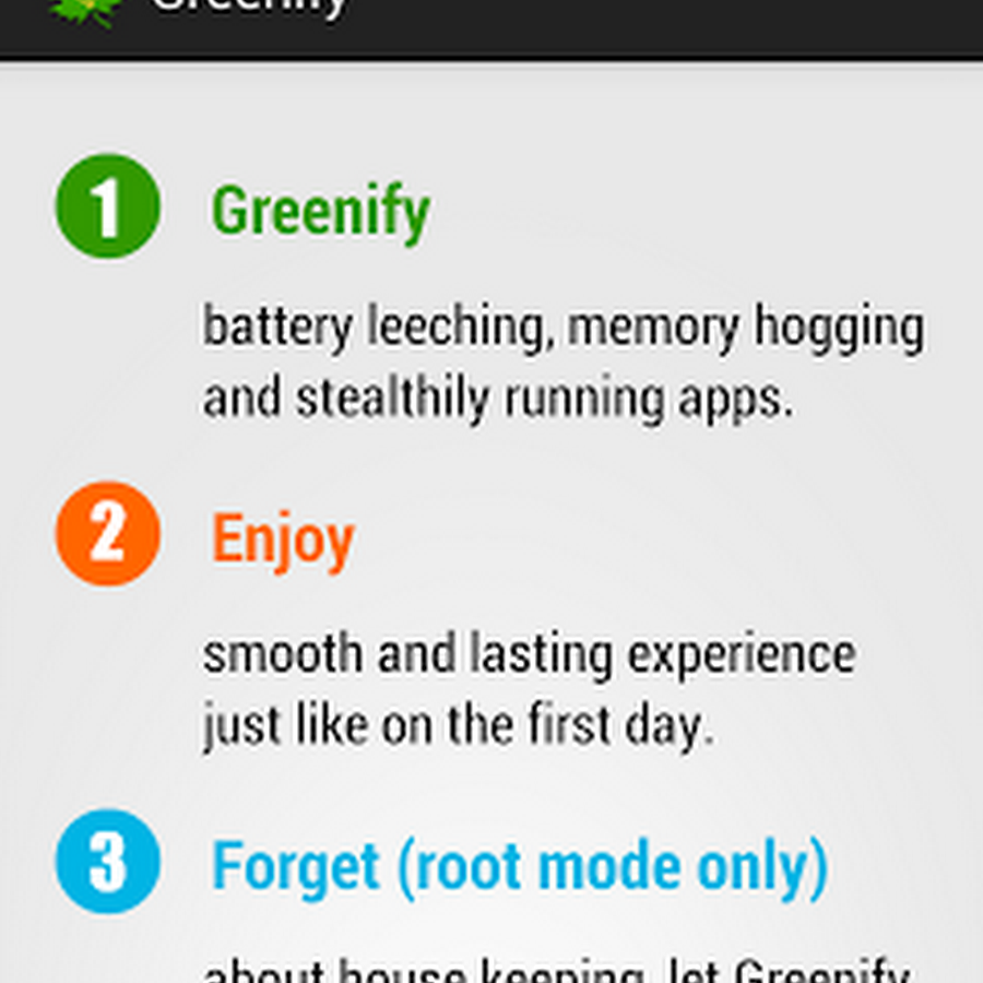 Note: Greenify do need a background persistent "Cleaner" service to put the greenified apps back into hibernation when you are not actively using them. It is designed and implemented in extremely lightweight, with an average RAM footprint at 3M in total, and nearly zero CPU and battery consumption.